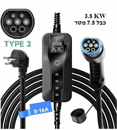 כבל באורך 7.5 מטר עם חיבור Type-2 ועם חיבור לחשמל ביתי עם תקע ישראלי תיקני.